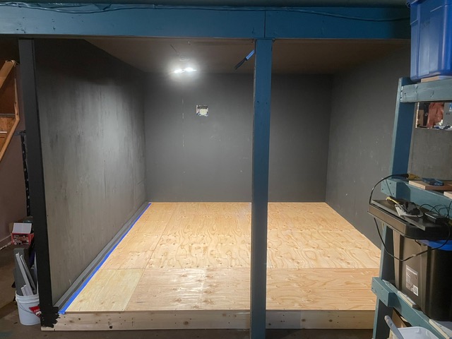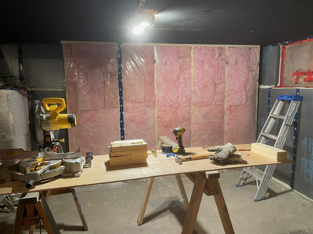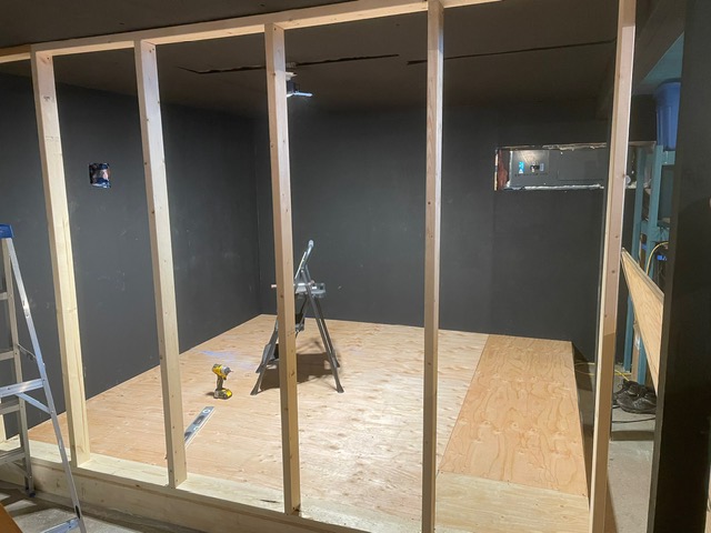 I helped a man build a stage for his drumkit in his basement. We sealed up the cracks in the concrete, applied 1 inch styrofoam insulation all the way around. We then built false walls, inserted insulation and sheeted them with plywood. We put insulation in the roof, and sheeted that as well. Then we put together the stage! By the time we were done, you could barely hear the kit being played from upstairs.