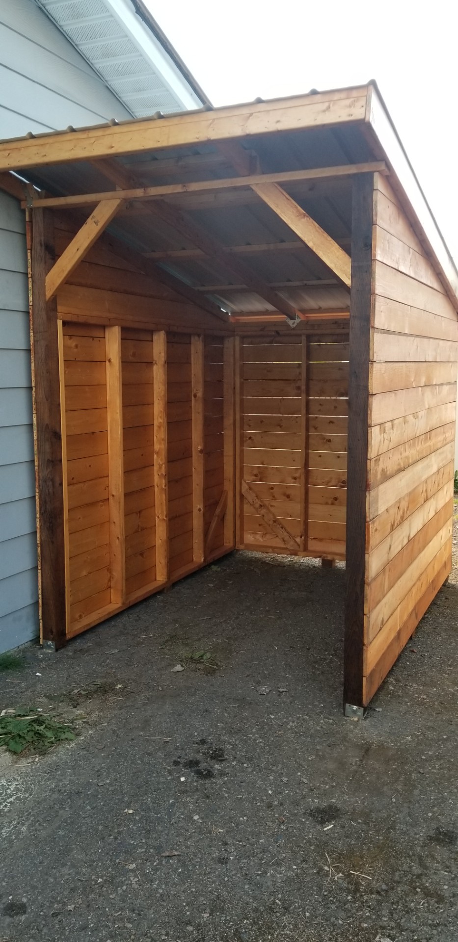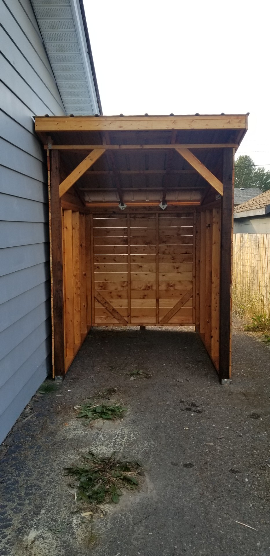 I built this shed for a woman so she could park her scooter somewhere dry. The four corner beams are anchored into her driveway. I used some leftover 1×6 boards she had from when she had her fence built to create the siding. The roof is galvanized sheet metal.