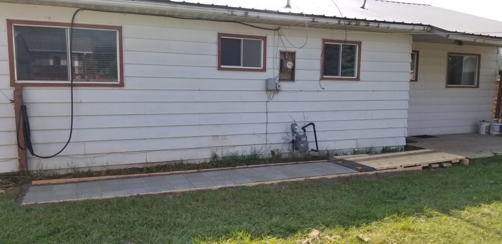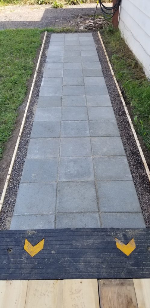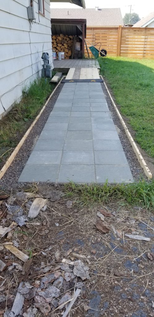 Created a pathway for a woman so she could drive her scooter to her backdoor. I dug down 8 inches into the dirt, tamped it down. I then filled the whole with a 6 inch layer of gravel. After that, a 1 inch layer of sand. Finally, I set down the tiles, used polymeric sand to fill in the gaps between them, bordered the tiles with playground gravel, and re-built the ramp up to the deck. I put in 1×6 boards as a border around the pathway, because her yard was very uneven. We didn’t want the playground gravel spilling out into the yard!