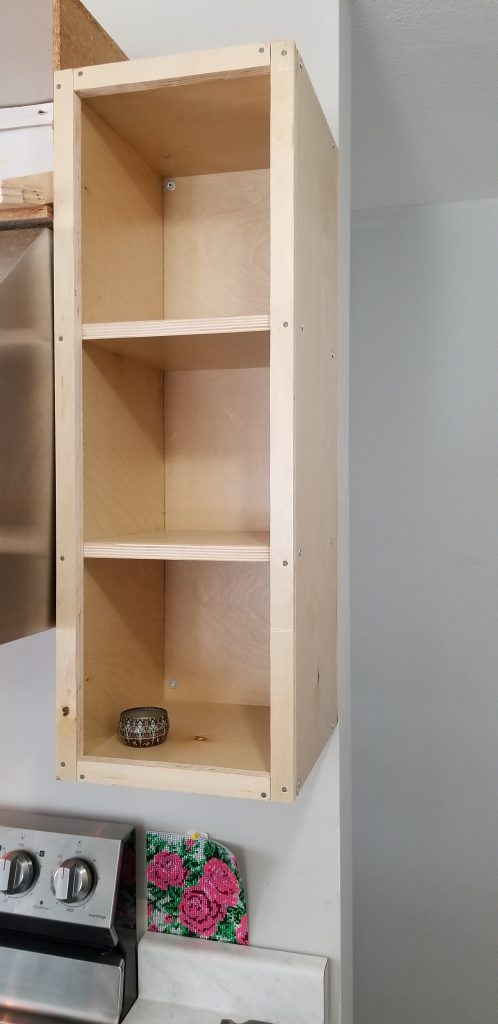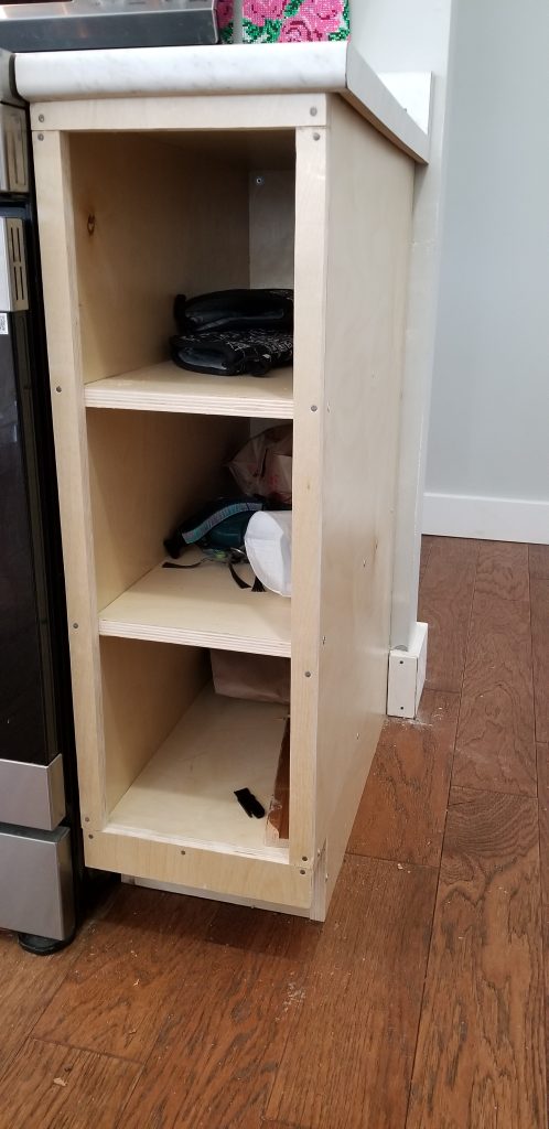 I built some cabinets for a woman. They’re made from 3/4″ Finished Birch, which is a beautiful wood. I then installed them for her.