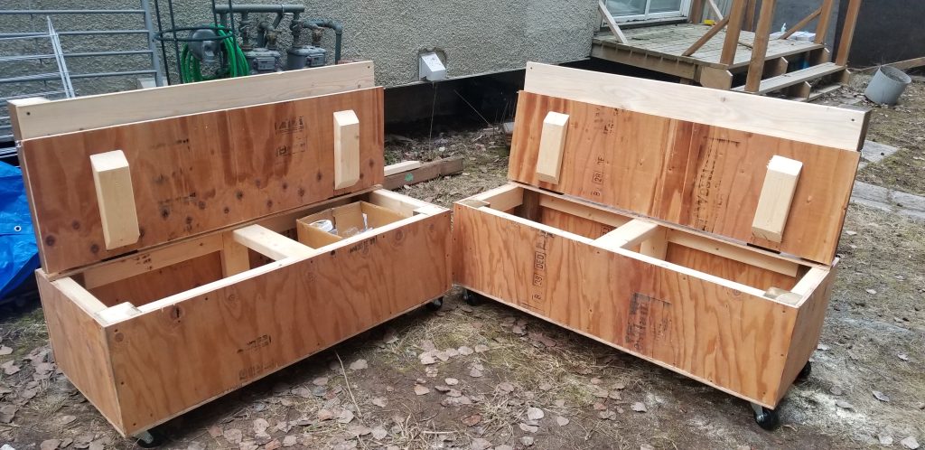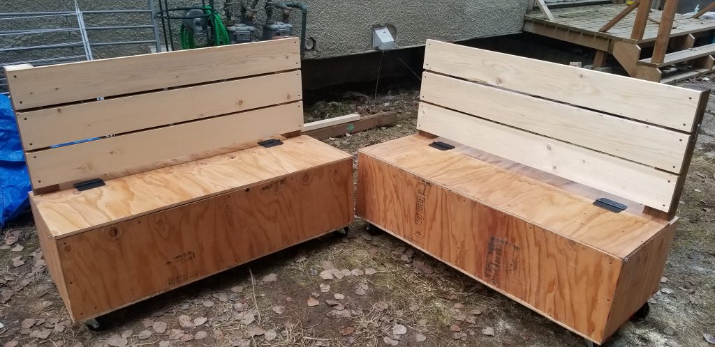 A couple benches I put together for a woman. Plenty of storage space inside, and they’re both on wheels! She painted and decorated them herself after I delivered them